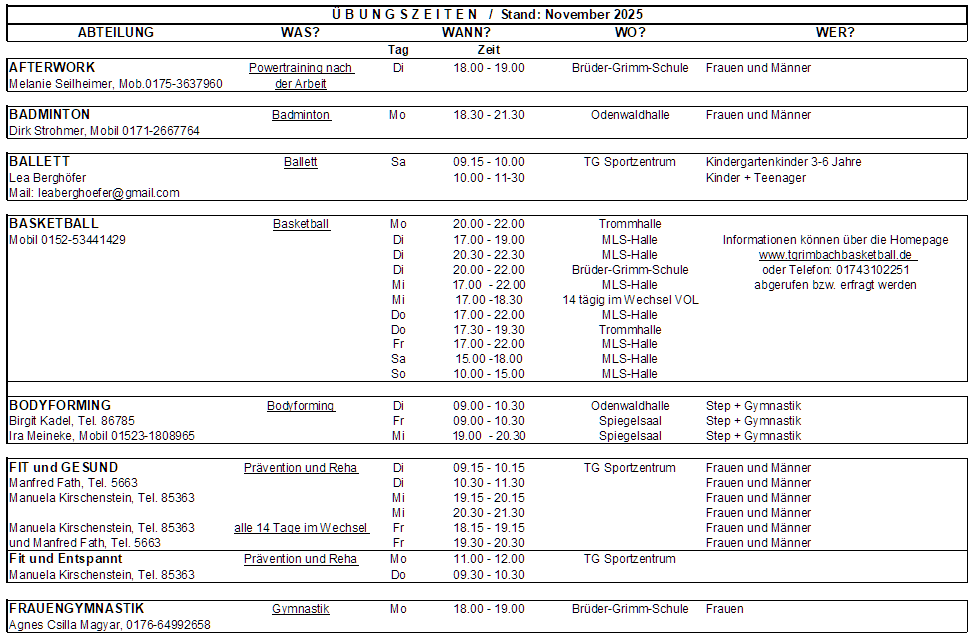 Hinweise zur Homepage: Die aktuelle Übersicht aller Trainingszeiten, Trainingsorte und Ansprechpartner finden Sie in der unten abrufbaren PDF-Datei. Zu allen Sportarten finden Sie diese Angaben auch in der vertikalen Hauptmenü-Leiste links. Dort finden Sie meist auch aktuelle Ankündigungen und Hinweise zum Trainingsbetrieb. Aktuelle Übungs- und Trainingszeiten finden Sie hier – zum vergößern anklicken.