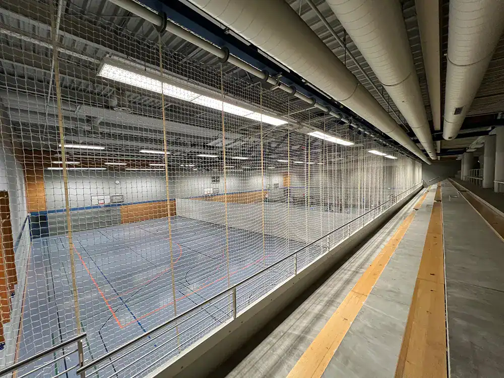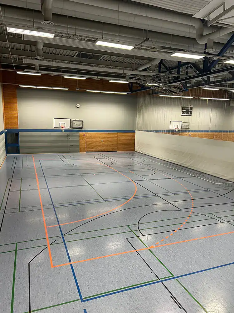 45 x 27 m (3 abteilbare Hallenteile á 15 x 27 m), Gymnastikraum, Kraftraum, Medienraum, Tribüne für 500 Personen, Cafeteria