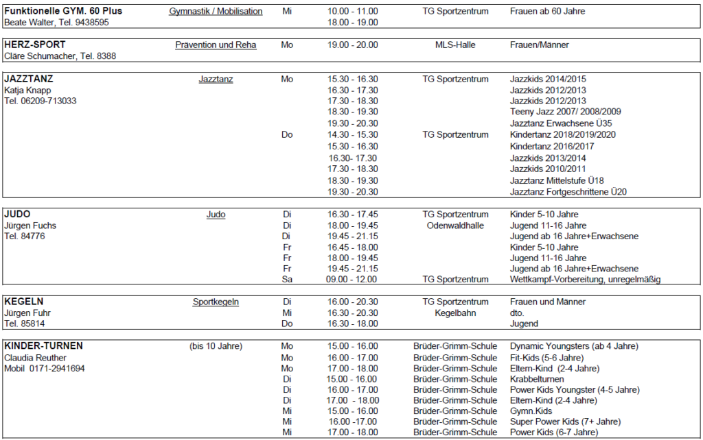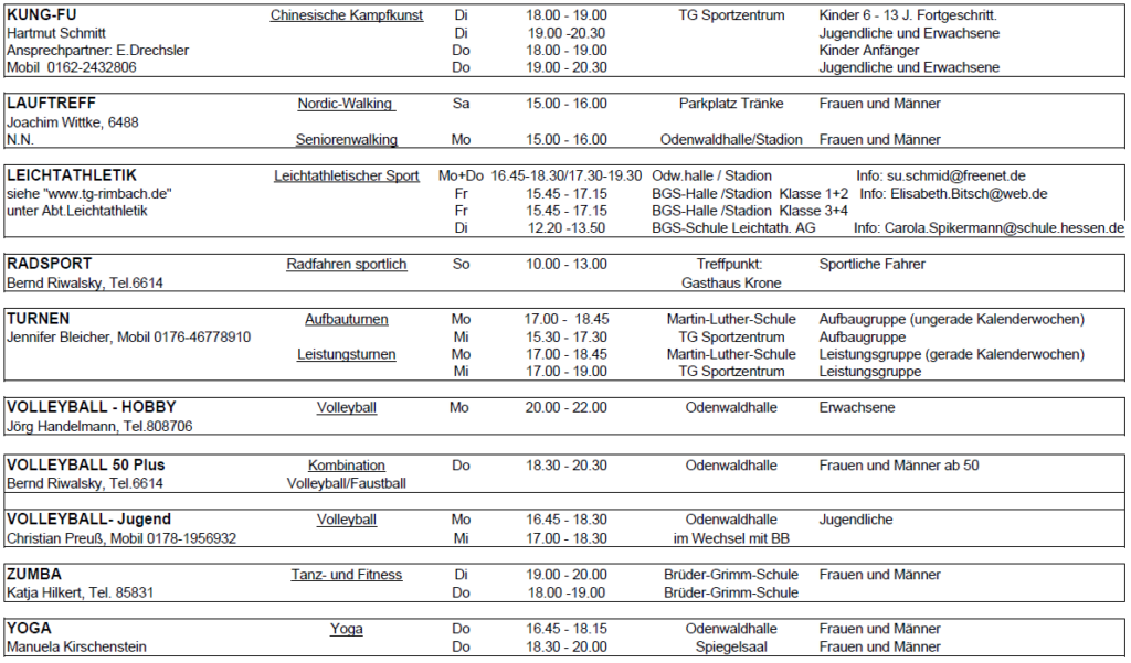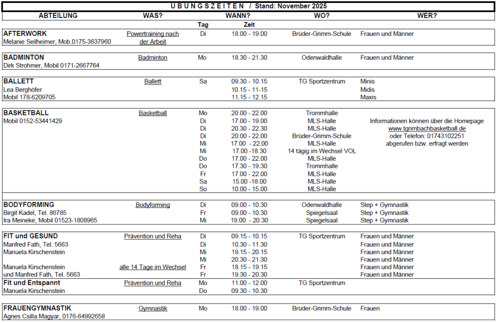 Hinweise zur Homepage: Die aktuelle Übersicht aller Trainingszeiten, Trainingsorte und Ansprechpartner finden Sie in der unten abrufbaren PDF-Datei. Zu allen Sportarten finden Sie diese Angaben auch in der vertikalen Hauptmenü-Leiste links. Dort finden Sie meist auch aktuelle Ankündigungen und Hinweise zum Trainingsbetrieb. Aktuelle Übungs- und Trainingszeiten finden Sie hier – zum vergößern anklicken.